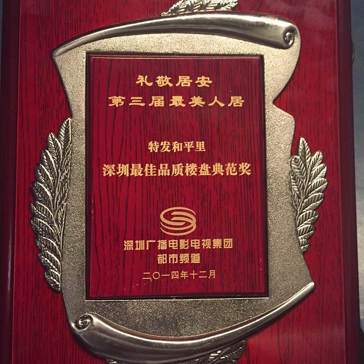 2014年1月22日下午,由深圳廣電集團(tuán)主辦、都市頻道承辦的“2014深圳樓市體檢報(bào)告首輪發(fā)布暨第三屆最美人居地產(chǎn)電視頒獎(jiǎng)盛典”隆重啟幕。本次頒獎(jiǎng)典禮以“禮敬居安——2014深圳樓市體檢報(bào)告首輪發(fā)布”為主題,來自珠三角地區(qū)以及深圳本土地產(chǎn)界500多位專家出席活動(dòng)。特發(fā)和平里項(xiàng)目憑借優(yōu)秀的品質(zhì)與杰出的業(yè)績(jī)表現(xiàn),榮獲“深圳最佳品質(zhì)樓盤典范獎(jiǎng)”。