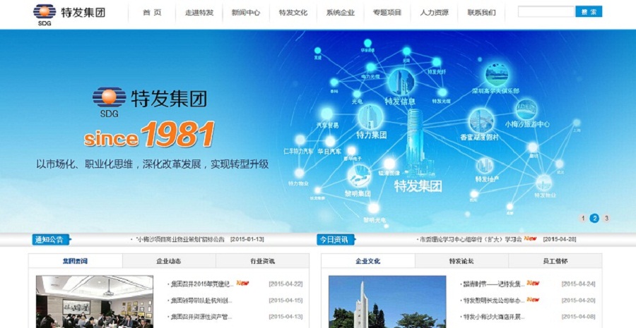 集團新版網(wǎng)站保留了原網(wǎng)站的部分功能元素,并在學(xué)習(xí)借鑒市國資系統(tǒng)兄弟單位門戶網(wǎng)站建設(shè)成果,以及充分征求集團領(lǐng)導(dǎo)、總部各部室、網(wǎng)站開發(fā)商意見建議的基礎(chǔ)上,根據(jù)集團經(jīng)營管理、業(yè)務(wù)宣傳、文化建設(shè)等需要,重點對網(wǎng)站的欄目設(shè)置、業(yè)務(wù)功能和頁面布局進(jìn)行了調(diào)整優(yōu)化。欄目設(shè)置方面,調(diào)整為8個一級欄目和23個二級欄目,主要板塊包括:走進(jìn)特發(fā)、新聞中心、特發(fā)文化、系統(tǒng)企業(yè)、專題項目和人力資源等,欄目內(nèi)容較以往更豐富、實用。業(yè)務(wù)功能方面,重點增加了重大項目展示、人力資源信息發(fā)布和部分二級欄目功能,網(wǎng)站整體功能較以往更健全。頁面布局方面,重點對導(dǎo)航鏈接端口位置、主圖展示區(qū)圖片、新聞?wù)故緟^(qū)區(qū)域設(shè)置和展示內(nèi)容等進(jìn)行了調(diào)整,形成了結(jié)構(gòu)更清晰、層次更分明、重點更突出、操作更便捷、特發(fā)元素更豐富的全新頁面布局。