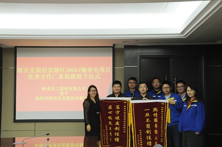 為表達(dá)對特發(fā)信息優(yōu)質(zhì)產(chǎn)品和高效服務(wù)的感謝之情,承建商特變電工將兩面寫著“匠心極致出精品,篤守進(jìn)度創(chuàng)佳績”和“一絲不茍創(chuàng)佳績,熱情服務(wù)保工期”的錦旗授予特發(fā)信息和公司工程人員。
