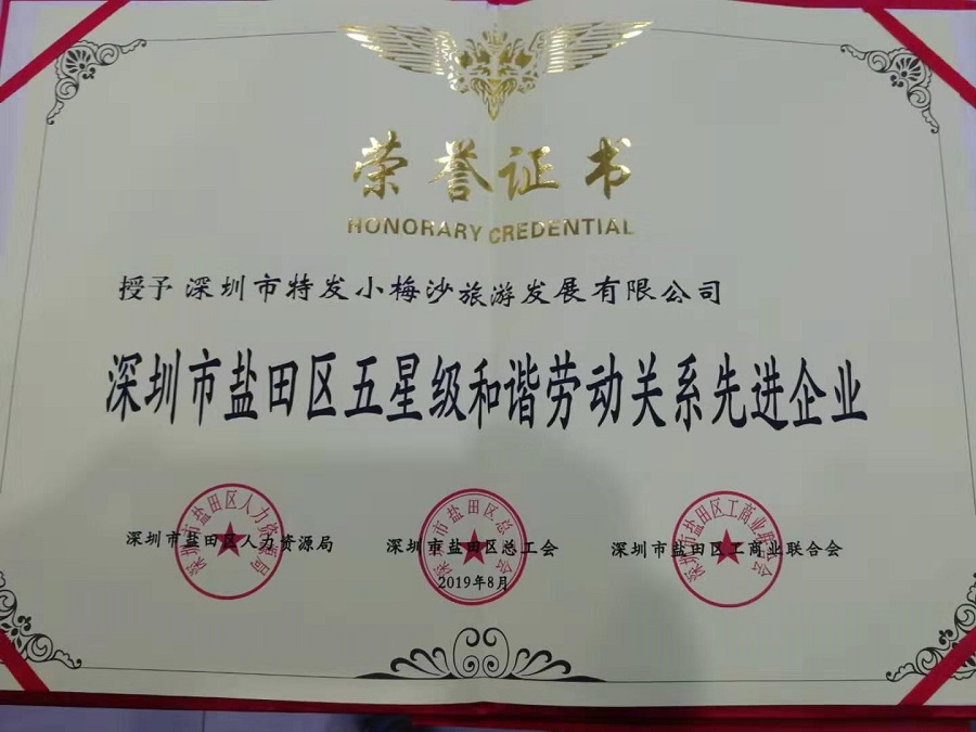 小梅沙旅游榮獲鹽田區(qū)五星級和諧勞動關(guān)系企業(yè)稱號