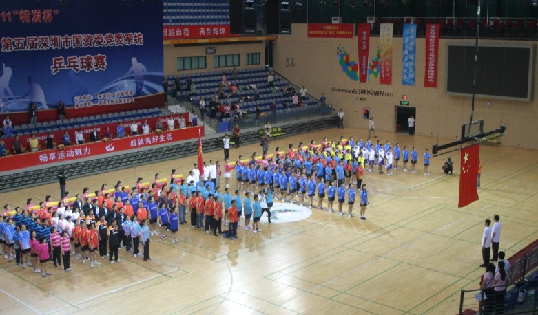 開(kāi)幕式于10月29日上午8:30舉行。市國(guó)資委黨委書記柏立新,特發(fā)集團(tuán)黨委書記、董事長(zhǎng)劉愛(ài)群、黨委副書記、總經(jīng)理施長(zhǎng)躍,國(guó)資委黨辦主任李明、副主任張曉中、唐明通,以及國(guó)資委系統(tǒng)企業(yè)的領(lǐng)導(dǎo)出席開(kāi)幕式。開(kāi)幕式由集團(tuán)總經(jīng)理施長(zhǎng)躍主持。此時(shí)的羅湖體育館一派歡快、濃烈的氛圍:主席臺(tái)正面高樹(shù)印有本次比賽徽標(biāo)和“2011‘特發(fā)杯’第五屆深圳市國(guó)資委黨委系統(tǒng)乒乓球賽”字樣的巨幅背景板,四周掛滿國(guó)資委和系統(tǒng)各企業(yè)的旗幟與祝比賽圓滿成功的條幅,以及“暢享運(yùn)動(dòng)魅力,成就美好生活”、“樹(shù)競(jìng)技風(fēng)尚,展國(guó)企風(fēng)采”等標(biāo)語(yǔ),各單位啦啦隊(duì)和觀眾坐滿看臺(tái)。伴隨著熱烈歡快的運(yùn)動(dòng)員進(jìn)行曲,來(lái)自國(guó)資委系統(tǒng)21家單位的22支代表隊(duì),在美麗端莊的引導(dǎo)員帶領(lǐng)下,隨著高舉國(guó)資委旗幟的旗手、護(hù)旗手依次入場(chǎng),隊(duì)員們意氣風(fēng)發(fā),精神飽滿,步伐矯健,隊(duì)列整齊。在全體起立奏唱國(guó)歌、莊嚴(yán)的升國(guó)旗儀式后,集團(tuán)董事長(zhǎng)劉愛(ài)群和國(guó)資委黨委書記柏立新分別代表承辦方和組委會(huì)先后致辭。