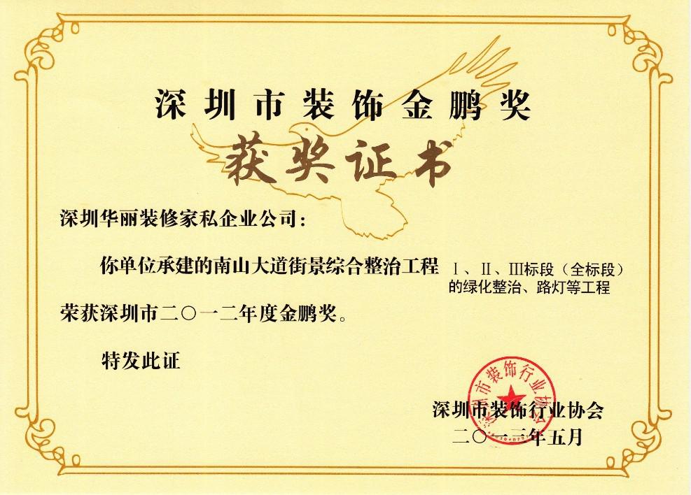 集團(tuán)參股企業(yè)華麗裝修家私企業(yè)公司承建的“南山大道街景綜合整治工程Ⅲ標(biāo)段”喜獲2012年度深圳裝飾工程金鵬獎(jiǎng)(公裝類)。2013年8月,深圳市裝飾行業(yè)協(xié)會(huì)授予華麗公司“深圳市裝飾工程金鵬獎(jiǎng)”獎(jiǎng)杯和證書,這是華麗公司繼2002年以來第五次榮獲 “深圳市裝飾工程金鵬獎(jiǎng)”。該獎(jiǎng)是我市優(yōu)質(zhì)裝飾工程獎(jiǎng),也是我市裝飾工程市級(jí)質(zhì)量獎(jiǎng),根據(jù)《深圳市裝飾工程金鵬獎(jiǎng)評(píng)選辦法》有關(guān)規(guī)定,深圳市裝飾行業(yè)協(xié)會(huì)秘書處組織專家對(duì)2012年度企業(yè)申報(bào)“金鵬獎(jiǎng)”資料及工程現(xiàn)場(chǎng)認(rèn)真檢查評(píng)比,經(jīng)“金鵬獎(jiǎng)”評(píng)委會(huì)評(píng)審?fù)ㄟ^,華麗公司榮獲此獎(jiǎng)。